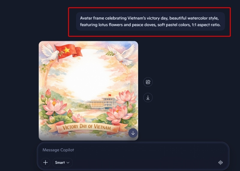 - Prompt 2 (Phong cách nghệ thuật): Avatar frame celebrating Vietnam’s victory day, beautiful watercolor style, featuring lotus flowers and peace doves, soft pastel colors, 1:1 aspect ratio.